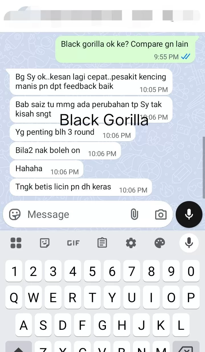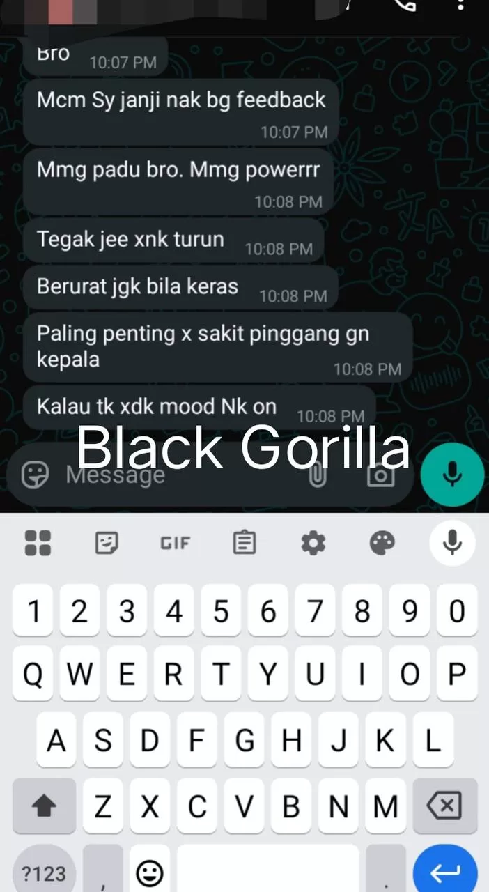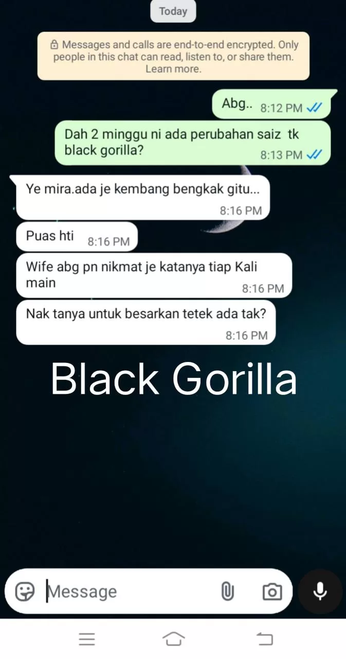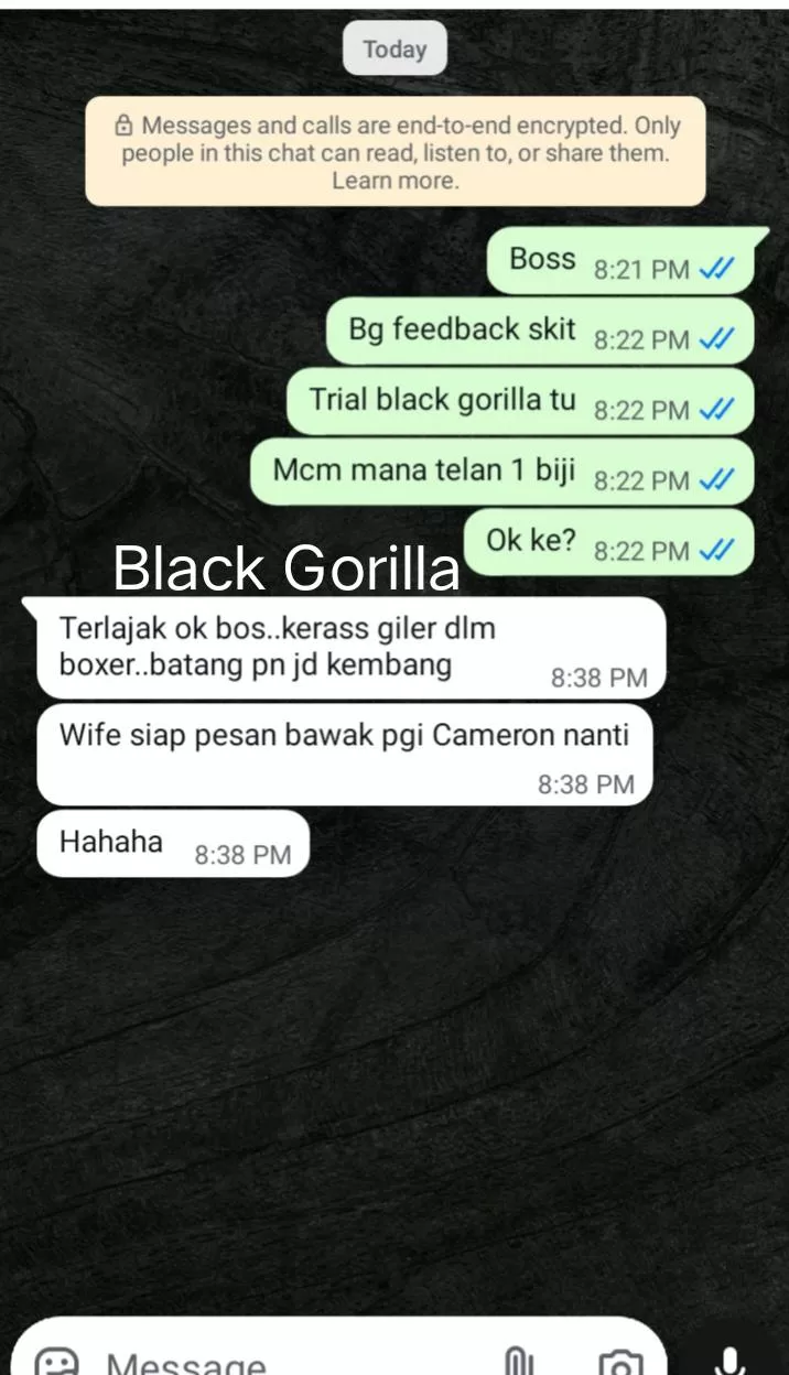 Bos, Black Gorilla harga tak mahal pun. Jangan Hanya Jadi Lelaki Biasa. Jadilah Sang Gorilla yang Diidamkan. Dengan Black Gorilla, anda bukan sekadar menyelesaikan masalah, tetapi anda mencapai tahap prestasi yang legenda.