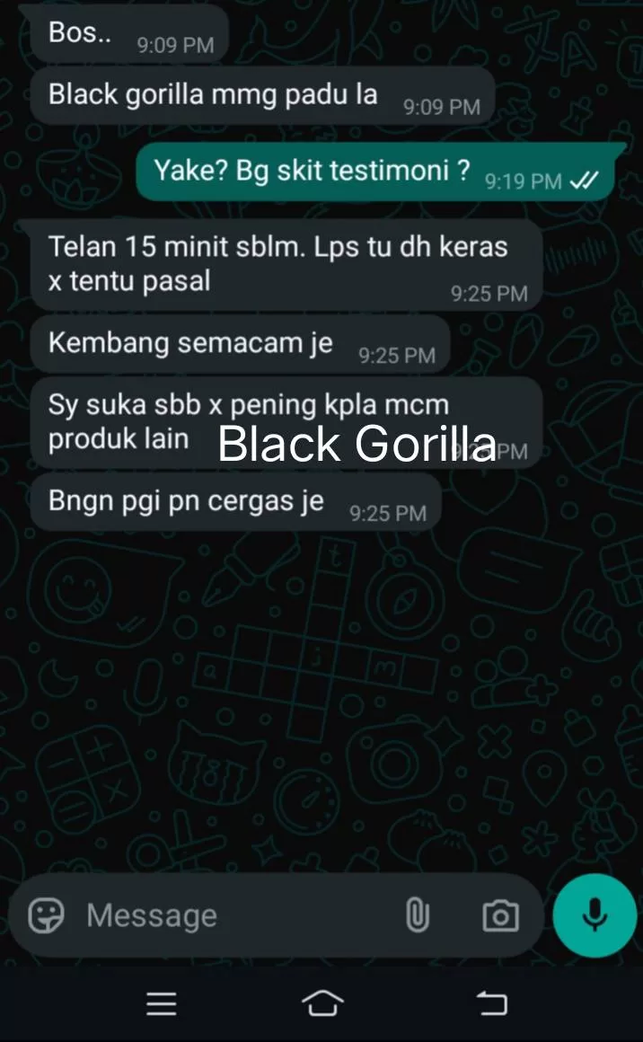 Black Gorilla ubat kuat terhebat! Atasi susah keras, kekal tegang lepas pancut & tahan lama. Keras macam kayu, naikkan nafsu gila. Testimoni puas!