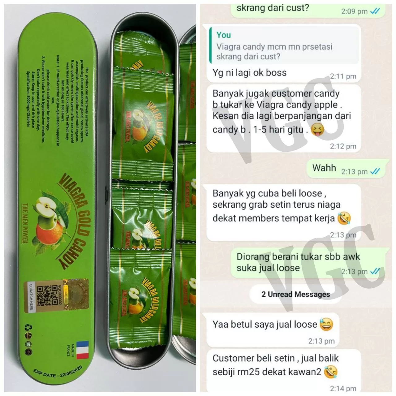 Viagra Gold Candy ialah produk supplement lelaki berbentuk gula-gula kunyah (candy) yang diformulasi khas untuk meningkatkan tenaga, melancarkan peredaran darah ke zakar, serta memberi kekuatan luar biasa ketika bersama pasangan.
